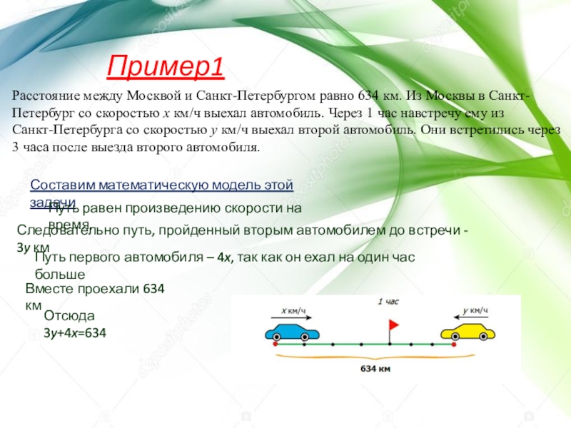 1 час навстречу ему из Санкт-Петербурга со скоростью y км/ч выехал второй автомобиль. Они встретились через