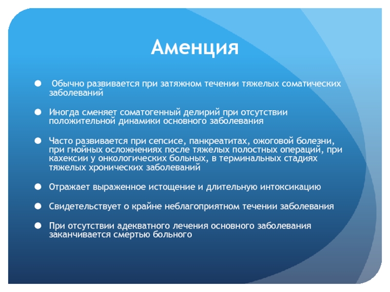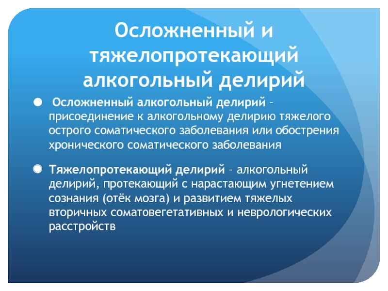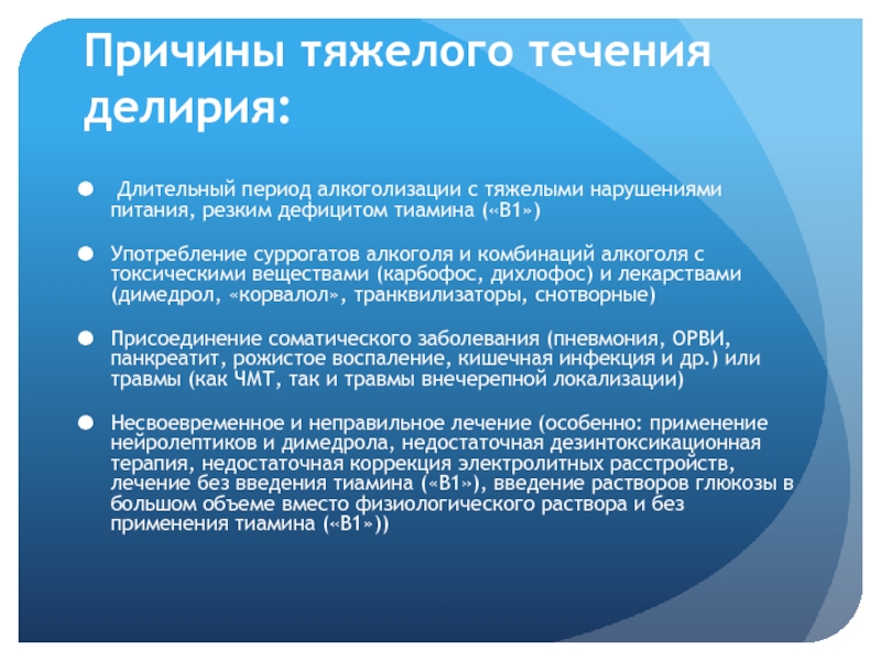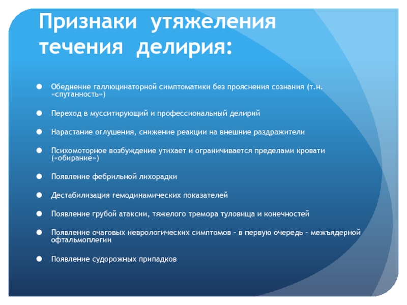 Развитие соматогенного делирия всегда указывает на ухудшение (утяжеление) состояния больного и неблагоприятное течение основного заболевания, поэтому требует неотложной помощи.