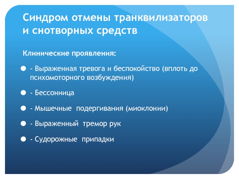 Слайд 34Синдром отмены транквилизаторов и снотворных средств