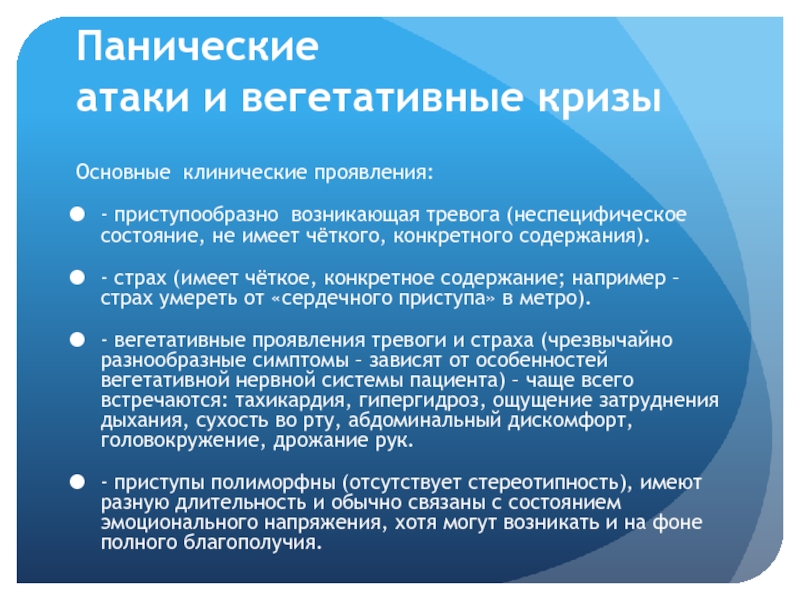- приступообразно возникающая тревога (неспецифическое состояние, не имеет
