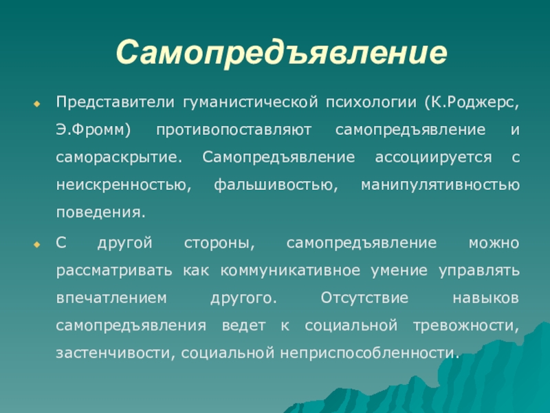 Представители гуманистической психологии (К.Роджерс, Э.Фромм) противопоставляют самопредъявление и самораскрытие. Самопредъявление
