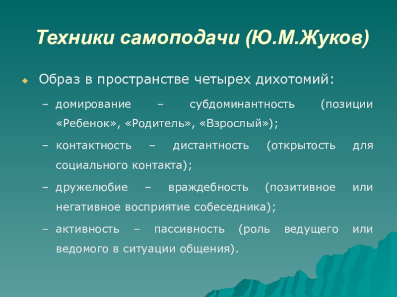 Слайд 54Техники самоподачи (Ю.М.Жуков)