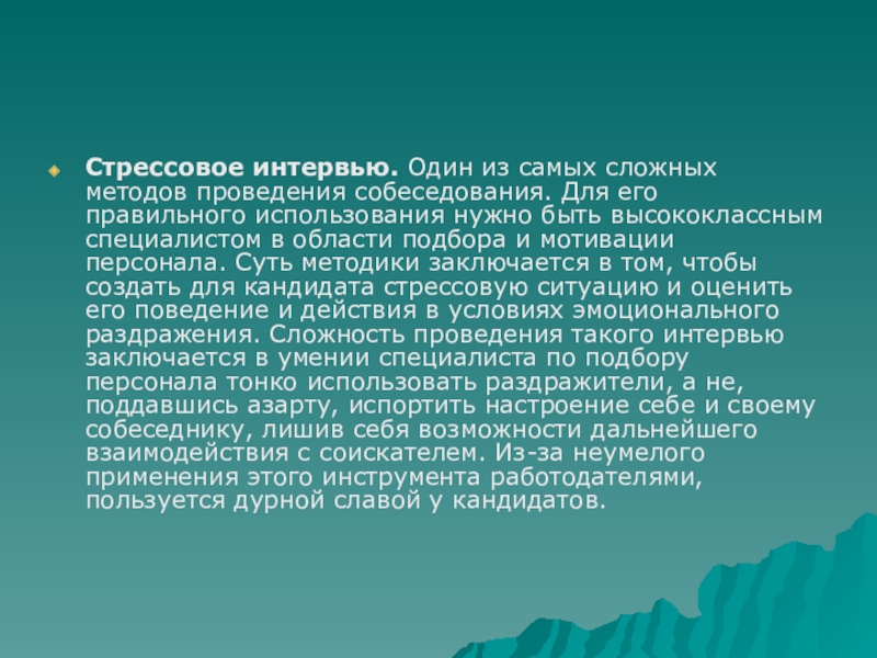 Слайд 19Стрессовое интервью. Один из самых сложных методов проведения собеседования. Для