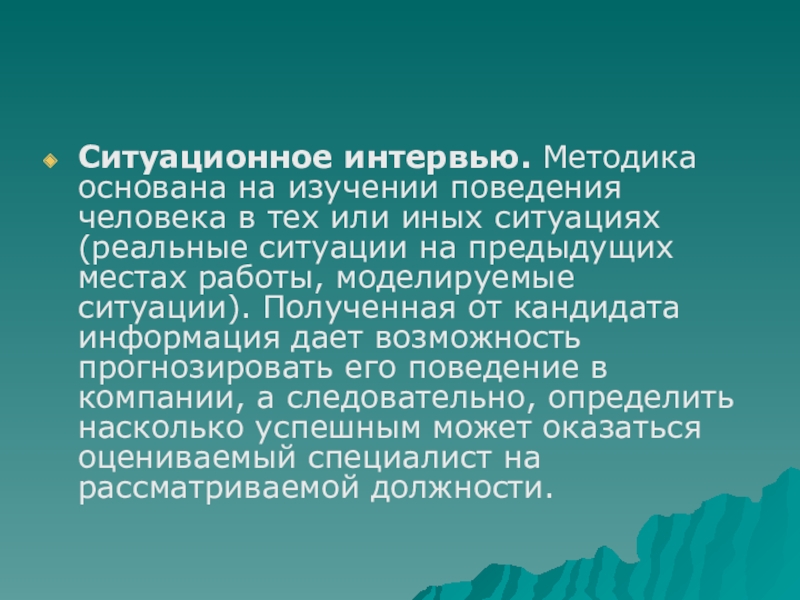 Слайд 18Ситуационное интервью. Методика основана на изучении поведения человека в тех