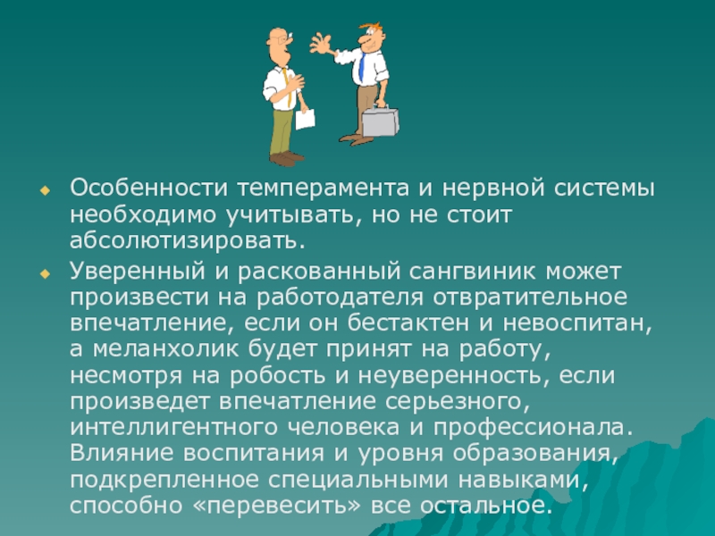 впечатление, если он бестактен и невоспитан, а меланхолик будет принят на работу, несмотря на робость и неуверенность, если произведет впечатление серьезного, интеллигентного человека и профессионала. Влияние воспитания и уровня образования, подкрепленное специальными навыками, способно «перевесить» все остальное.