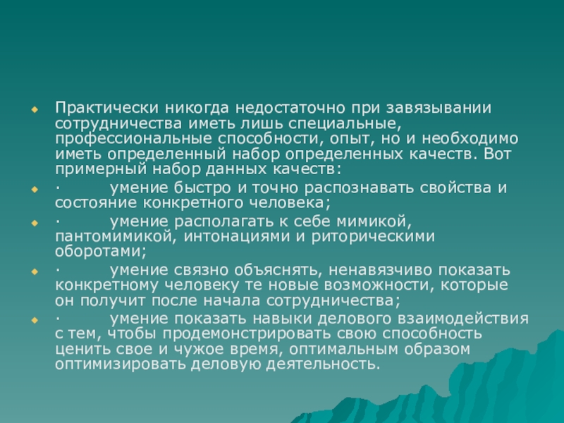 Слайд 10Практически никогда недостаточно при завязывании сотрудничества иметь лишь специальные, профессиональные