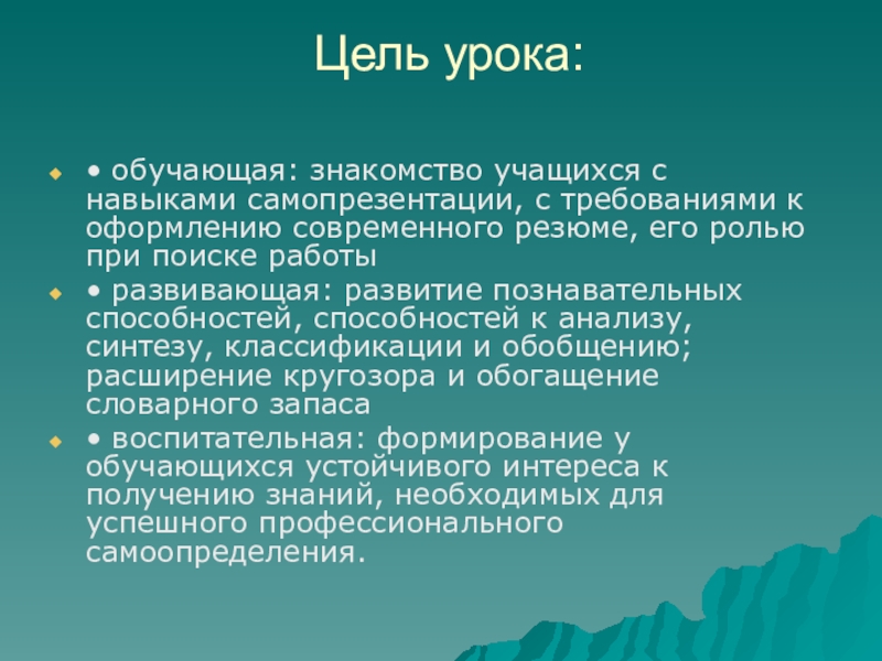 • обучающая: знакомство учащихся с навыками самопрезентации, с требованиями