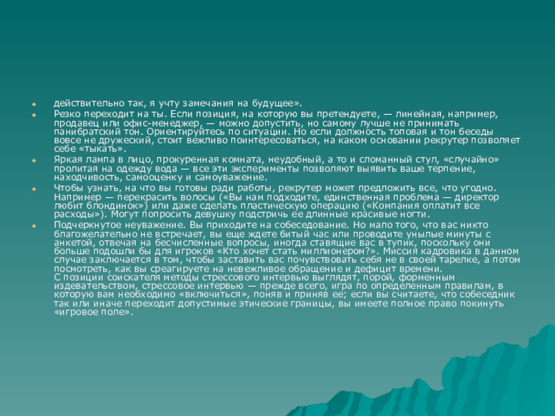 С позиции соискателя методы стрессового интервью выглядят, порой, форменным издевательством, стрессовое интервью — прежде всего, игра по определенным правилам, в которую вам необходимо «включиться», поняв и приняв ее; если вы считаете, что собеседник так или иначе переходит допустимые этические границы, вы имеете полное право покинуть «игровое поле».
