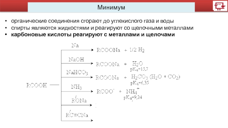 Минимуморганические соединения сгорают до углекислого газа и водыспирты являются жидкостями и реагируют со щелочными металламикарбоновые кислоты реагируют