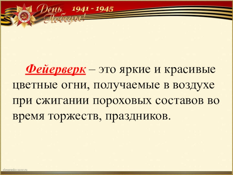 Слайд 11 Фейерверк – это яркие и красивые цветные огни,