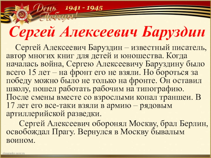 война, Сергею Алексеевичу Баруздину было всего 15 лет – на фронт его не взяли. Но бороться за победу можно было не только на фронте. Он оставил школу, пошел работать рабочим на типографию. После смены вместе со взрослыми копал траншеи. В 17 лет его все-таки взяли в армию – рядовым артиллерийской разведки.