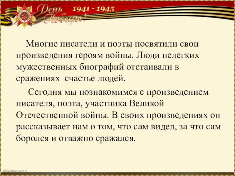 Сегодня мы познакомимся с произведением писателя, поэта, участника Великой Отечественной войны. В своих произведениях он рассказывает нам о том, что сам видел, за что сам боролся и отважно сражался.