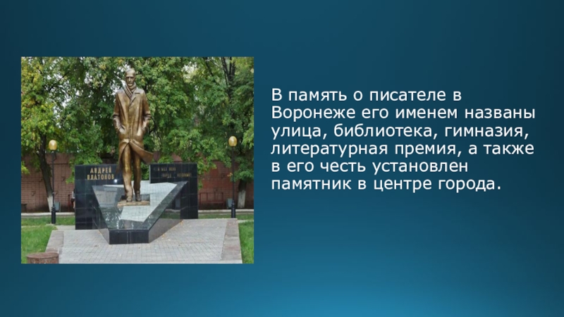 Слайд 10В память о писателе в Воронеже его именем названы улица,