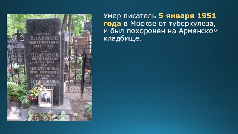 Слайд 9Умер писатель 5 января 1951 года в Москве от туберкулеза,
