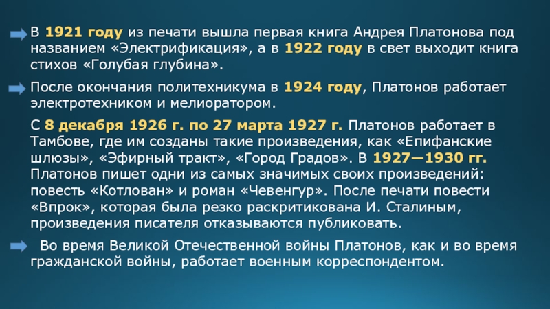 С 8 декабря 1926 г. по 27 марта 1927 г. Платонов работает в Тамбове, где им созданы такие произведения, как «Епифанские шлюзы», «Эфирный тракт», «Город Градов». В 1927—1930 гг. Платонов пишет одни из самых значимых своих произведений: повесть «Котлован» и роман «Чевенгур». После печати повести «Впрок», которая была резко раскритикована И. Сталиным, произведения писателя отказываются публиковать.