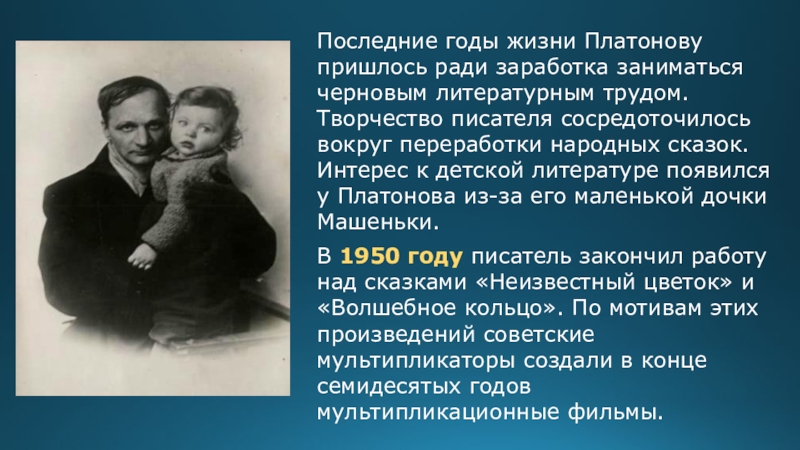 Слайд 8Последние годы жизни Платонову пришлось ради заработка заниматься черновым литературным