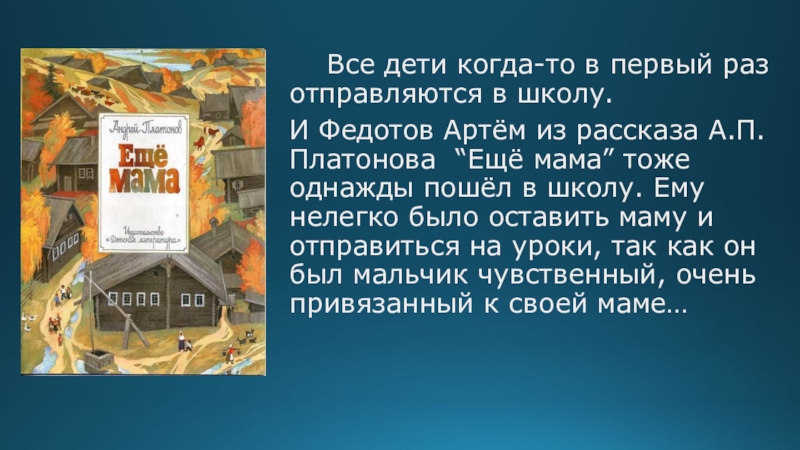 мама” тоже однажды пошёл в школу. Ему нелегко было оставить маму и отправиться на уроки, так как он был мальчик чувственный, очень привязанный к своей маме…