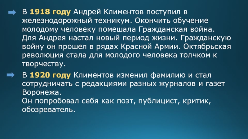 Слайд 6В 1918 году Андрей Климентов поступил в железнодорожный техникум. Окончить