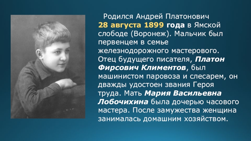 28 августа 1899 года в Ямской слободе (Воронеж). Мальчик был