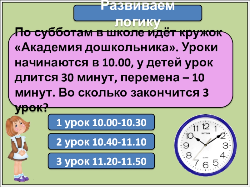 – 10 минут. Во сколько закончится 3 урок?1 урок 10.00-10.30