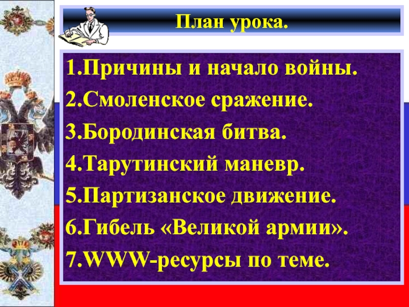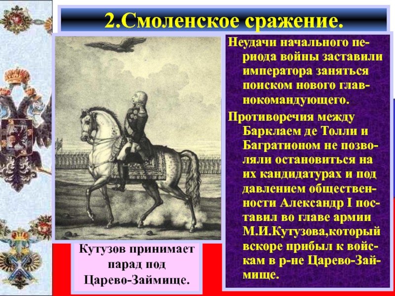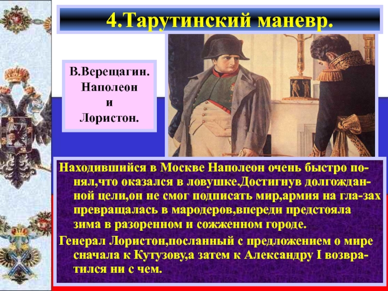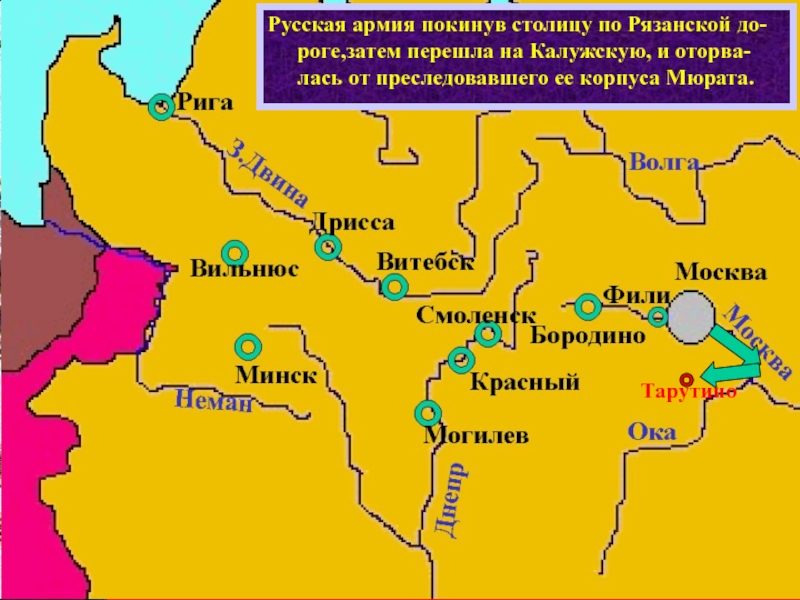 Кутузов двигался вдоль Старой Смоленской до- роги,вступая в бой только тогда когда францу-зы пытались повернуть на юг.Великая армия таяла на глазах.