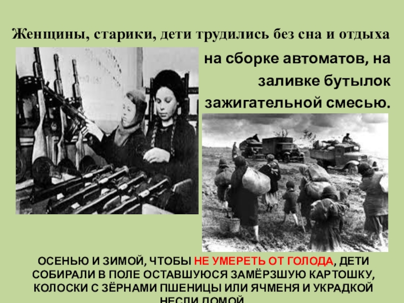 Осенью и зимой, чтобы не умереть от голода, дети собирали в поле оставшуюся замёрзшую картошку, колоски с зёрнами пшеницы или ячменя и украдкой несли домой.