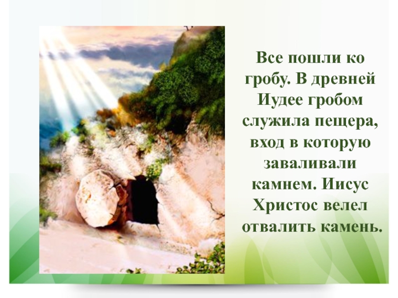 Слайд 11Все пошли ко гробу. В древней Иудее гробом служила пещера,