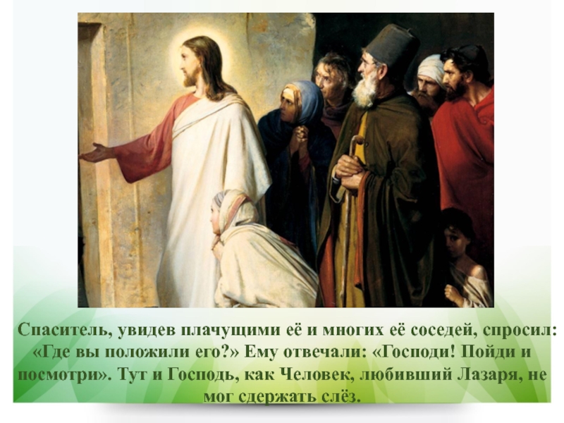 Слайд 10Спаситель, увидев плачущими её и многих её соседей, спросил: «Где