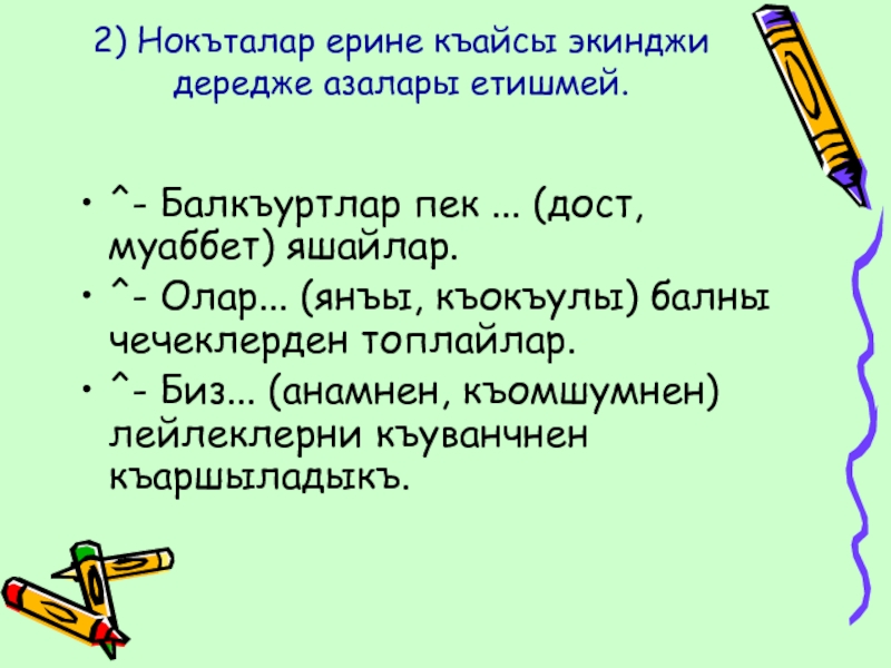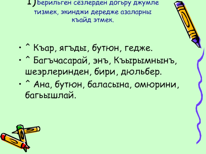 Слайд 71) Берильген сёзлерден догьру джумле тизмек, экинджи дередже азаларны