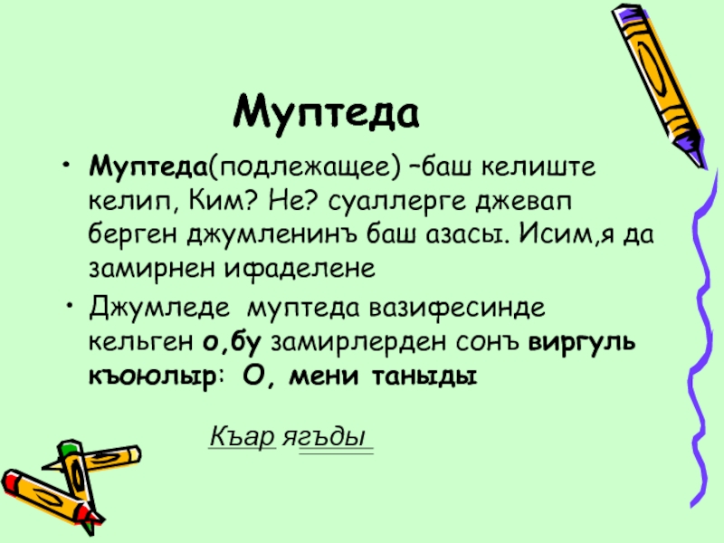 Муптеда(подлежащее) –баш келиште келип, Ким? Не? суаллерге джевап берген джумленинъ