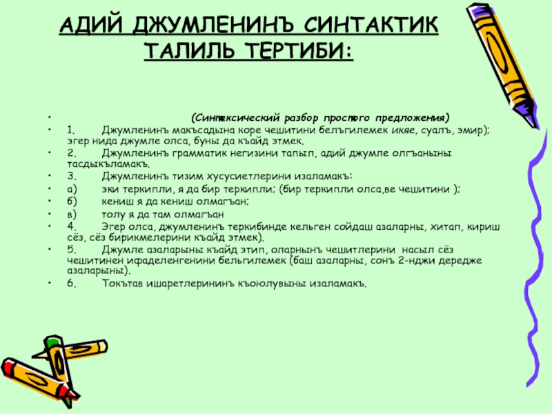 Слайд 11АДИЙ ДЖУМЛЕНИНЪ СИНТАКТИК ТАЛИЛЬ ТЕРТИБИ: