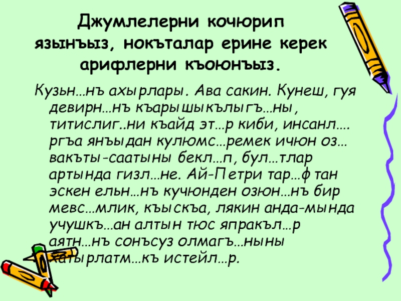 Слайд 9Джумлелерни кочюрип язынъыз, нокъталар ерине керек арифлерни къоюнъыз.