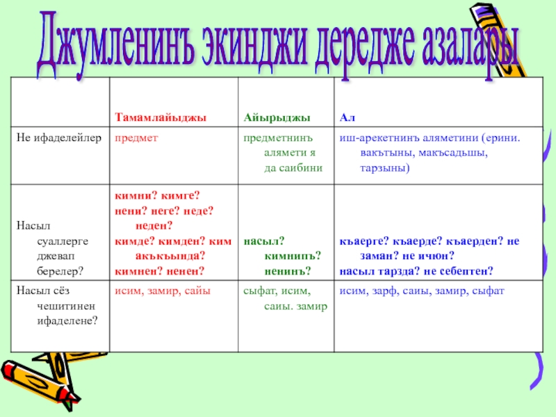 5. Джумле азаларыны къайд этип, оларнынъ чешитлерини насыл сёз чешитинен ифаделенгенини бельгилемек (баш азаларны, сонъ 2-нджи дередже азаларыны).
