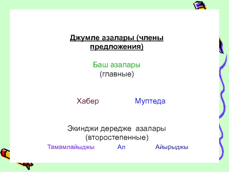 Слайд 3Джумле азалары (члены предложения)