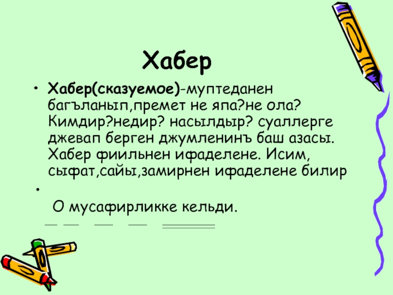 Хабер(сказуемое)-муптеданен багъланып,премет не япа?не ола? Кимдир?недир? насылдыр? суаллерге джевап берген
