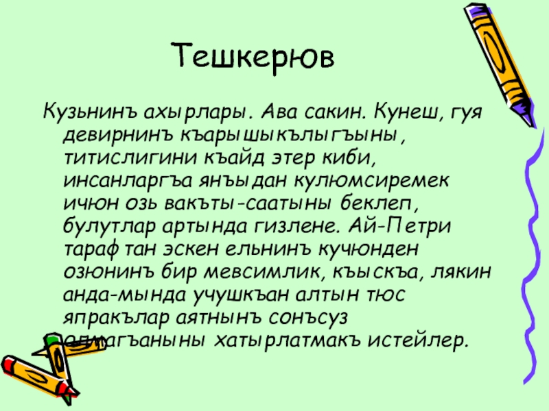 янъыдан кулюмс…ремек ичюн оз… вакъты-саатыны бекл…п, бул…тлар артында гизл…не. Ай-Петри тар…фтан эскен ельн…нъ кучюнден озюн…нъ бир мевс…млик, къыскъа, лякин анда-мында учушкъ…ан алтын тюс япракъл…р аятн…нъ сонъсуз олмагъ…ныны хатырлатм…къ истейл…р.