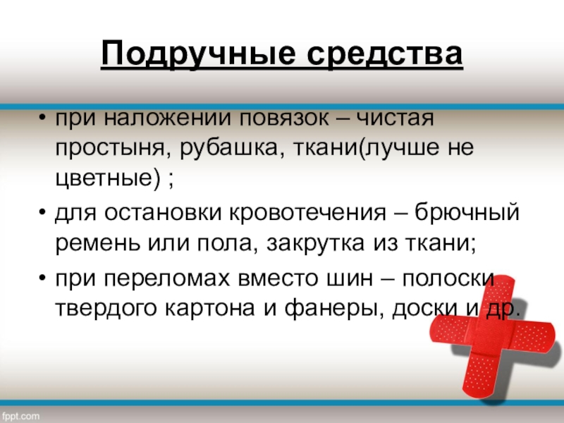 при наложении повязок – чистая простыня, рубашка, ткани(лучше