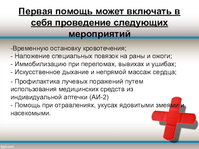 Слайд 5Первая помощь может включать в себя проведение следующих мероприятий