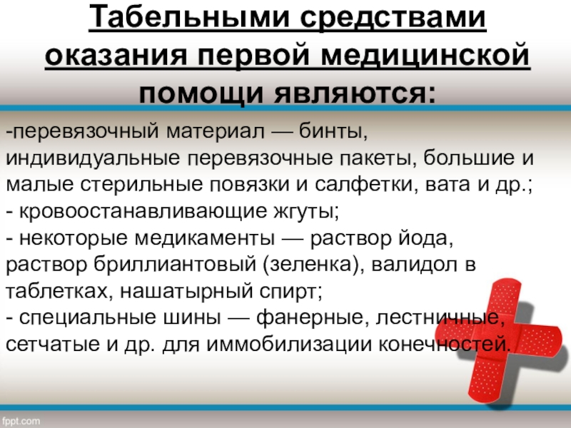 Слайд 7Табельными средствами оказания первой медицинской помощи являются: