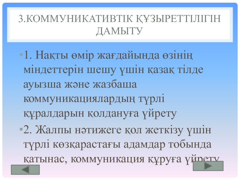 1. ақпараттарды өз бетімен табуға, талдауға, іріктеуге, қайта құруға және қазіргі заманғы ақпараттық –коммуникациялық технологиялардың көмегімен жүзіге асыруға үйрету.