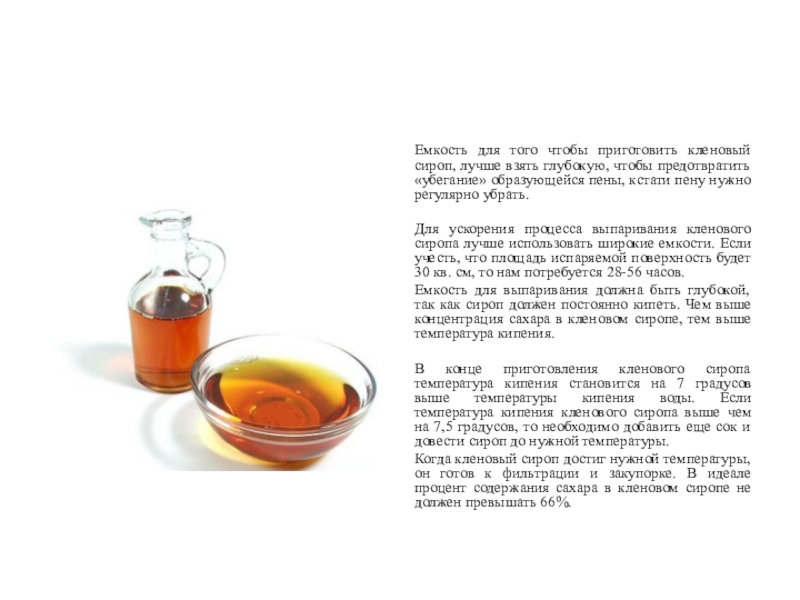 Слайд 19Емкость для того чтобы приготовить кленовый сироп, лучше взять глубокую,