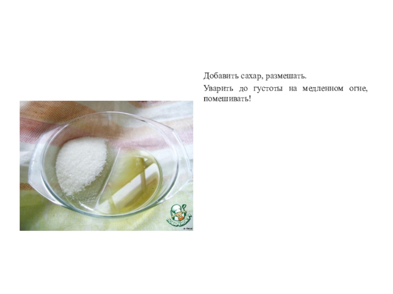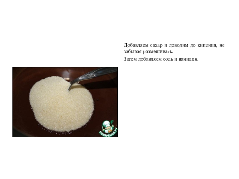 Слайд 4Добавляем сахар и доводим до кипения, не забывая размешивать.