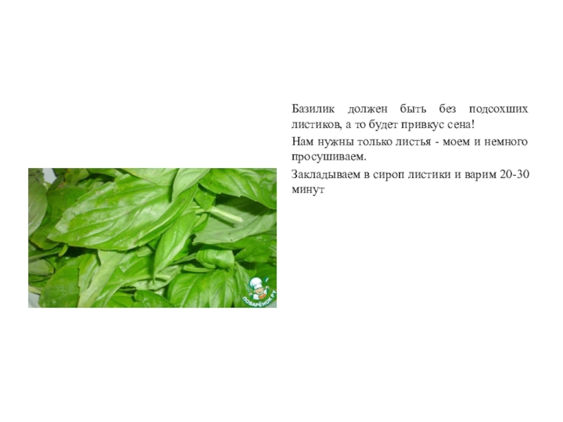 Слайд 14Базилик должен быть без подсохших листиков, а то будет привкус