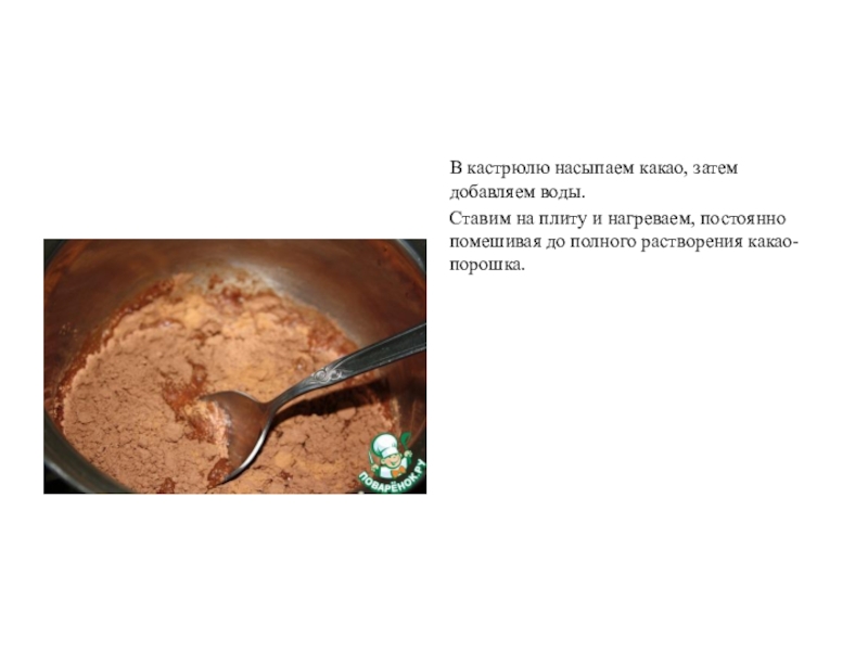 Слайд 3В кастрюлю насыпаем какао, затем добавляем воды.