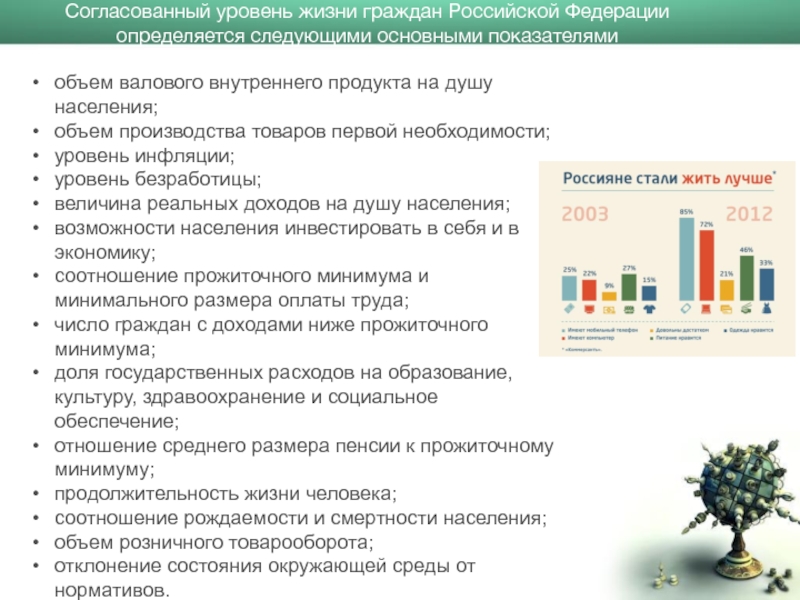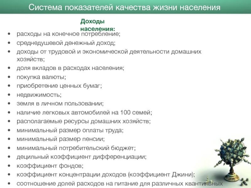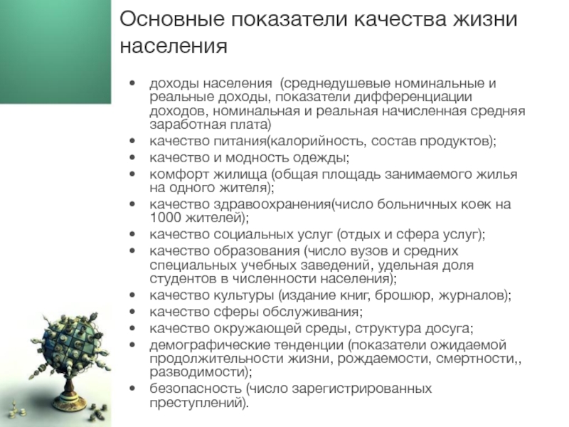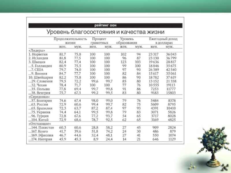 Для сопоставления уровня жизни в разных странах в мировой практике используют также следующие показатели: