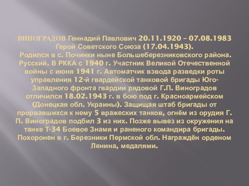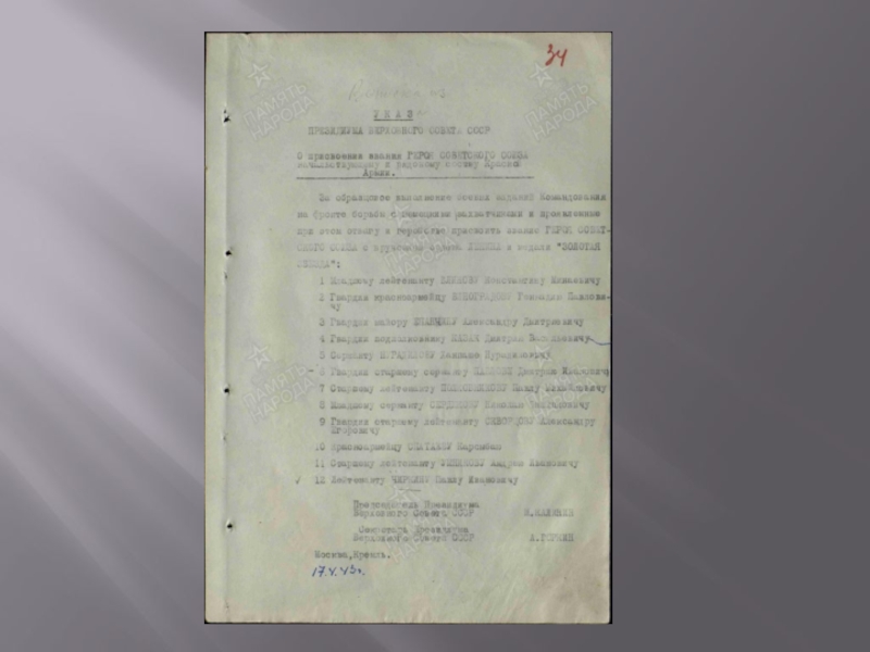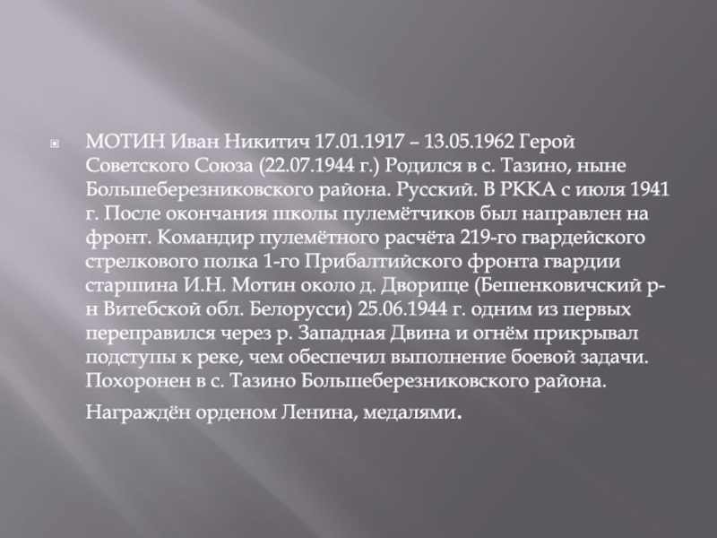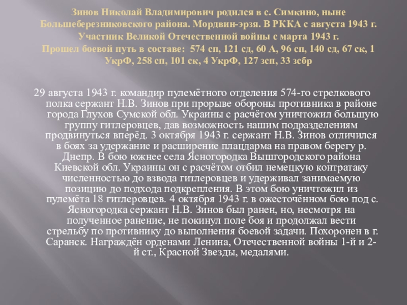 29 августа 1943 г. командир пулемётного отделения 574-го стрелкового полка сержант Н.В. Зинов при прорыве обороны противника в районе города Глухов Сумской обл. Украины с расчётом уничтожил большую группу гитлеровцев, дав возможность нашим подразделениям продвинуться вперёд. 3 октября 1943 г. сержант Н.В. Зинов отличился в боях за удержание и расширение плацдарма на правом берегу р. Днепр. В бою южнее села Ясногородка Вышгородского района Киевской обл. Украины он с расчётом отбил немецкую контратаку численностью до взвода гитлеровцев и удерживал занимаемую позицию до подхода подкрепления. В этом бою уничтожил из пулемёта 18 гитлеровцев. 4 октября 1943 г. в ожесточённом бою под с. Ясногородка сержант Н.В. Зинов был ранен, но, несмотря на полученное ранение, не покинул поле боя и продолжал вести стрельбу по противнику до выполнения боевой задачи. Похоронен в г. Саранск. Награждён орденами Ленина, Отечественной войны 1-й и 2-й ст., Красной Звезды, медалями.