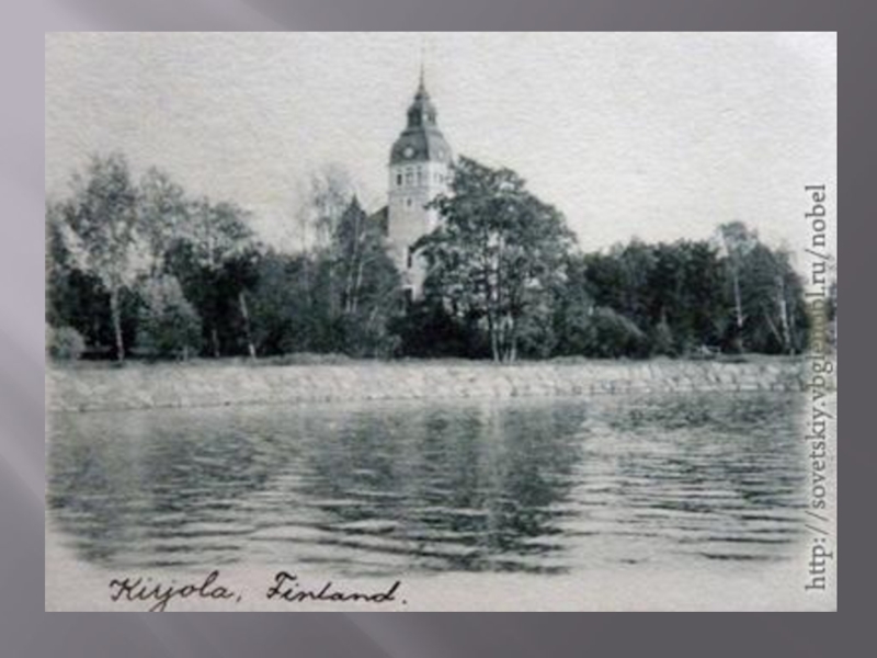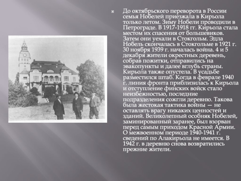 Слайд 14До октябрьского переворота в России семья Нобелей приезжала в Кирьола