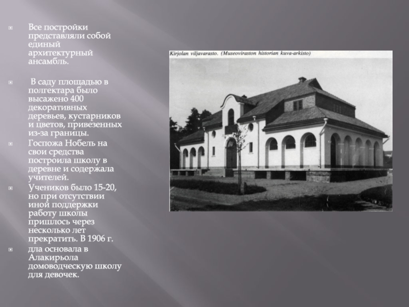 Госпожа Нобель на свои средства построила школу в деревне и содержала учителей.