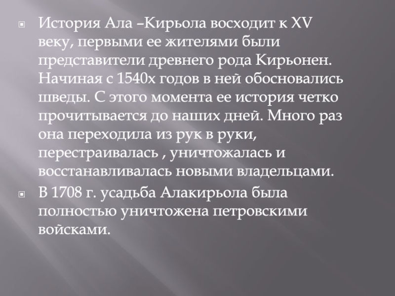 Слайд 2История Ала –Кирьола восходит к XV веку, первыми ее жителями