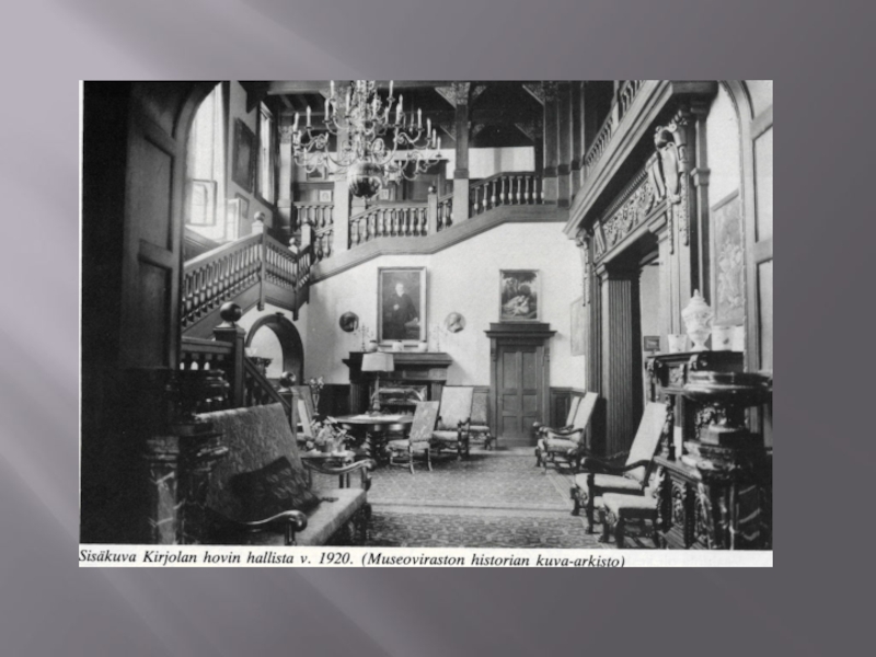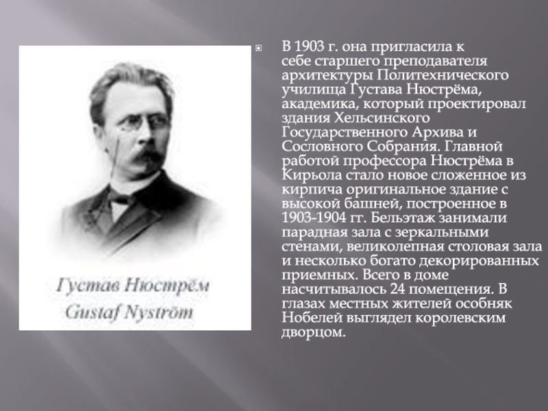 и Сословного Собрания. Главной работой профессора Нюстрёма в Кирьола стало новое сложенное из кирпича оригинальное здание с высокой башней, построенное в 1903-1904 гг. Бельэтаж занимали парадная зала с зеркальными стенами, великолепная столовая зала и несколько богато декорированных приемных. Всего в доме насчитывалось 24 помещения. В глазах местных жителей особняк Нобелей выглядел королевским дворцом.
